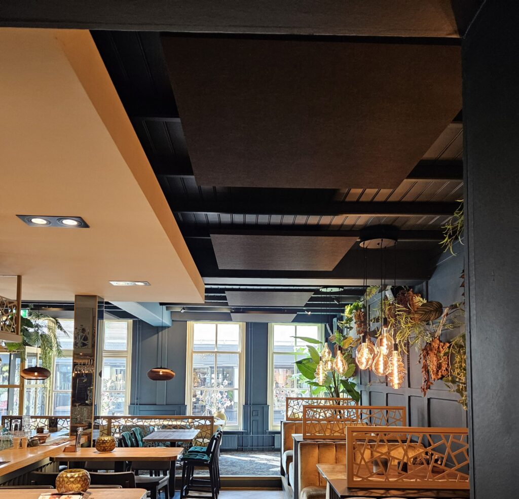 We hebben hier gebruik gemaakt van akoestische panelen in de kleur zwart. Door ze aan het plafond te monteren passen deze mooi in het bestaande interieurontwerp.